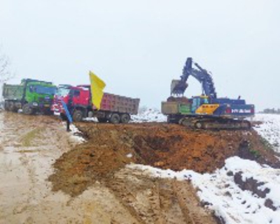 2月7日,大悟县普降大雪,阳平循环经济产业园一期湖北聚海磷石膏项目建设现场,5台施工车辆不停歇,确保新年项目土方建设稳步推进,为实现年底建成投产奠定基础。通讯员付波 摄