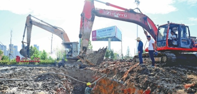 10月2日,孝感城区城南大道改造施工现场,施工人员正在浇灌地下综合管廊。国庆假日期间,孝感城南大道工程建设工地一片忙碌景象,建设者们坚守岗位,奋战在工地上,加班加点赶进度,确保城南大道准时通车。(全媒体记者李文勇 摄