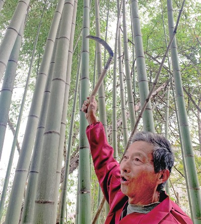 11月18日,安陆市王义贞镇朱桥村八组村民方贤贵正在选竹上市。方贤贵为了增加家庭收入,自行开发自家房前屋后的山坡岗地10多亩,种植五月竹等竹子品种,俏销周边县市,月收入2000元左右。全媒体记者匡文杰 摄