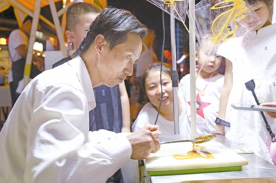 近日,在安陆东大“落日集市”上,中国糖画非遗传承人刘华林展示糖画手工艺术。