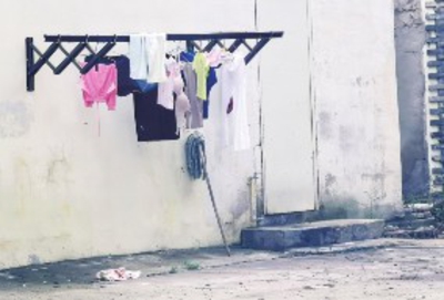 在体育大道与长征路交会处附近,家兴烟酒超市旁部分住户在门前晾晒衣物(图④)。