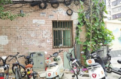 在黄陂大道美雅口腔东侧巷道,电动车与自行车随意停放在巷道口,楼房墙面存在牛皮癣,绿植与电线缠绕存在安全隐患(图③)。