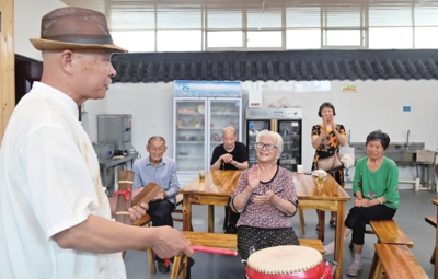 开餐前,老人在幸福食堂内进行打鼓说书表演。
