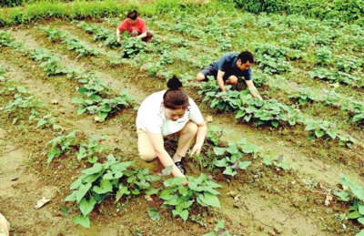 村民在共享菜园除草、施肥,这里的蔬菜主要供应食堂。