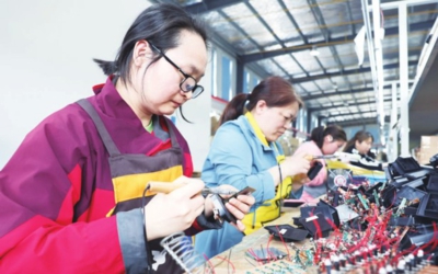 4月9日,在大悟县的丰太电子科技有限公司生产车间,"家门口"就业的员工在焊接、质检出口德国的新能源灯具。■全媒体记者李文勇特约记者李杨通讯员刘阳摄 |
