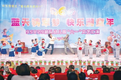 5月30日,驻孝95829部队幼儿园师生在表演舞蹈《红色记忆》。当日,该园举行“蓝天铸军梦快乐润童年”“六一”文艺汇演,幼儿园师生与95829部队官兵近300人表演了《哪吒闹六一》《月光下的中国》《军魂舞韵》等十余个精彩节目。