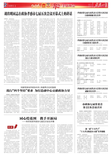 上接1版 这一年,我们坚定不移兴办实事、破解难题,民生福祉持续增进。坚持投资于物和投资于人紧密结合,注重在发展中保障和改善民生,让更多发展成果惠及人民群众。民生支出占比保持在75%以上,省、市111项民生实事全部完成,就业就学就医、社会保障等领域短板加快补齐,城市社区和3千人以上村老年助餐服务全覆盖,育儿补贴制度和学前一年免费政策全面落实,王者荣耀全国大赛总决赛、麻糖米酒文化节成功举办,槐荫船说、祥云湾火爆出圈,县乡两级综治中心规范化建设高质量完成,矛盾纠纷排查化解“三个户户”走访常态化,人民群众获得感幸福感安全感不断增强。 成就源于奋斗,发展汇聚合力。这些成绩的取得,根本在于以习近平同志为核心的党中央领航掌舵,在于习近平新时代中国特色社会主义思想科学指引,是省委、省政府正确领导的结果,是全市上下齐心协力、团结奋斗的结果,也凝聚着全市各级政协组织、广大政协委员、社会各界人士的智慧、心血和汗水。过去的一年,全市各级政协组织和广大政协委员紧紧围绕团结和民主两大主题,政治建设有力、服务大局有为、协商民主有效、凝聚共识有方,为全市经济社会发展做了大量卓有成效的工作。在此,我代表中共孝感市委,向全市各级政协组织和广大政协委员,向各民主党派、工商联、各人民团体和社会各界人士,表示衷心的感谢并致以崇高的敬意! 各位委员、同志们! 2026年是“十五五”开局之年。市委七届十四次全会、市委经济工作会议描绘了当前和今后一个时期的发展蓝图,吹响了打造武汉都市圈副中心城市的奋进号角。实现这一奋斗目标,需要全市上下与时俱进、加力奋进,也需要人民政协齐心协力、同向发力。全市各级政协组织和广大政协委员,要把思想和行动统一到市委的决策部署上来,建诤言、献良策、出实招,用担当诠释初心、用奋斗承载使命,凝神聚力推动高质量发展,为加快打造武汉都市圈副中心城市、奋力谱写中国式现代化孝感篇章贡献智慧力量。在此,我代表中共孝感市委,对政协工作提四点希望: 第一,坚持同心同德,坚定政治方向。政治属性是政协工作的根本属性。各级政协组织和广大政协委员,要深刻把握人民政协的这一鲜明特质,把旗帜鲜明讲政治贯穿政协履职各方面全过程。要坚持党的领导,深刻领会“两个确立”的决定性意义,切实增强“四个意识”、坚定“四个自信”、做到“两个维护”,始终在政治立场、政治方向、政治原则、政治道路上同以习近平同志为核心的党中央保持高度一致。要强化理论武装,自觉用习近平新时代中国特色社会主义思想统揽政协工作,把党中央决策部署和省委、市委工作要求转化为社会各界的广泛共识和思想自觉,确保政协事业始终沿着正确方向前进。要严守纪律规矩,争当政治生态和社会风气的引领者、示范者,共同营造既畅所欲言、各抒己见,又理性有度、合法依章的良好协商氛围。 第二,坚持聚智聚力,倾力服务大局。围绕中心、服务大局是政协履行职能的重要原则。各级政协组织和广大政协委员,要坚持向中心聚焦、为大局聚力,着眼大事、关注实事、紧盯难事,促进党委、政府科学决策、有效施策。要精准建言献策,围绕市委七届十三次、十四次全会确定的工作部署,聚焦“十五五”规划实施,科学确定协商议题,精心组织调查研究,深入开展协商议政,提出更多有价值、有分量的睿智之言、务实之策、可行之举。要汇聚众智众力,充分发挥政协凝心聚力的团结优势、人才荟萃的智力优势、协调关系的功能优势、联系广泛的界别优势,搭好“连心桥”、传递“好声音”,推动更多项目、资本、人才、技术向孝感集聚。要加强民主监督,聚焦市委、市政府重大决策实施、重点项目推进、重要工作落实开展民主监督,完善监督机制,创新监督方式,发挥协商式监督优势,以协商促改进、以监督促落实,使政协民主监督成为解决问题、增进团结、凝心聚力的过程。 第三,坚持用心用情,努力改善民生。“人民政协为人民”是政协履行职能的价值取向。各级政协组织和广大政协委员,要坚持以人民为中心的发展思想,做到政为民所议、言为民所建、策为民所献、力为民所出。要倾听民声,深入基层、深入群众,感知民情冷暖,倾听群众诉求,及时准确收集、表达、反映群众愿望,协助党委政府做好问需于民、问计于民、问智于民工作。要善解民忧,聚焦“幼有善育、学有优教、劳有厚得、病有良医、老有颐养、住有宜居、弱有众扶”,通过视察、调研、协商、监督等多种方式,提出高质量的提案和调研报告,以实际行动回应人民群众关切。要情暖民心,在界别群众中多做春风化雨、化解矛盾的工作,多做温暖人心、鼓舞士气的工作,引导界别群众理解、支持、参与全市改革发展稳定工作。 第四,坚持强基强能,提升履职水平。加强自身建设,是政协履行职能、发挥作用的前提基础。各级政协组织和广大政协委员,要认真贯彻落实习近平总书记关于加强和改进人民政协工作的重要思想,加强履职能力建设,推动政协工作提质增效。要建强委员队伍,着力打造“懂政协、会协商、善议政,守纪律、讲规矩、重品行”的政协委员队伍,引导委员珍视政治身份、塑造职业精神、提高履职能力,把政协建设成为委员之家、民主之家、团结之家。要发挥委