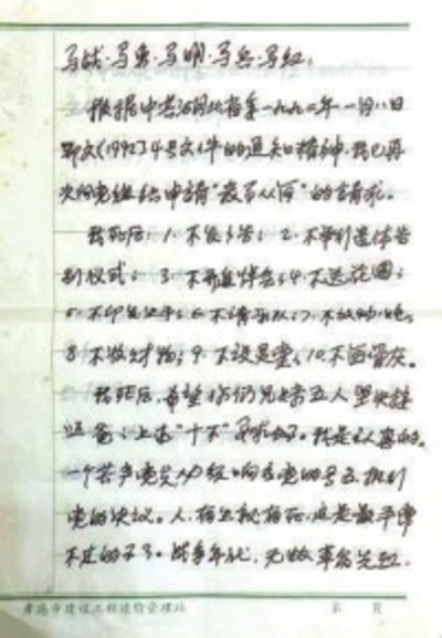 早在1991年,他就主动向所在党支部提出丧事从简的申请。2008年10月,他更是郑重写下两份嘱托,一份留给儿女、一份递交建委党组,明确立下“十不”遗嘱:不发讣告、不举行遗体告别、不送花圈、不开追悼会、不印发生平、不请乐队、不放鞭炮、不收财物、不设灵堂、不留骨灰。字字句句,尽显一名共产党员的无私与坦荡。